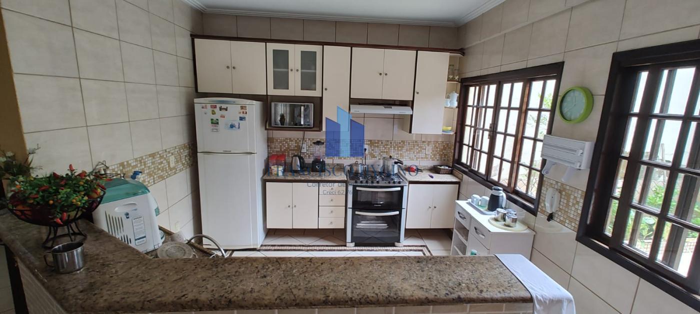 Térreo- Varanda, sala com 50 m2, sala de estar, lavabo, copa, cozinha com móveis planejados, área de serviço, área de lazer com churrasqueira e fogão à lenha, garagem.